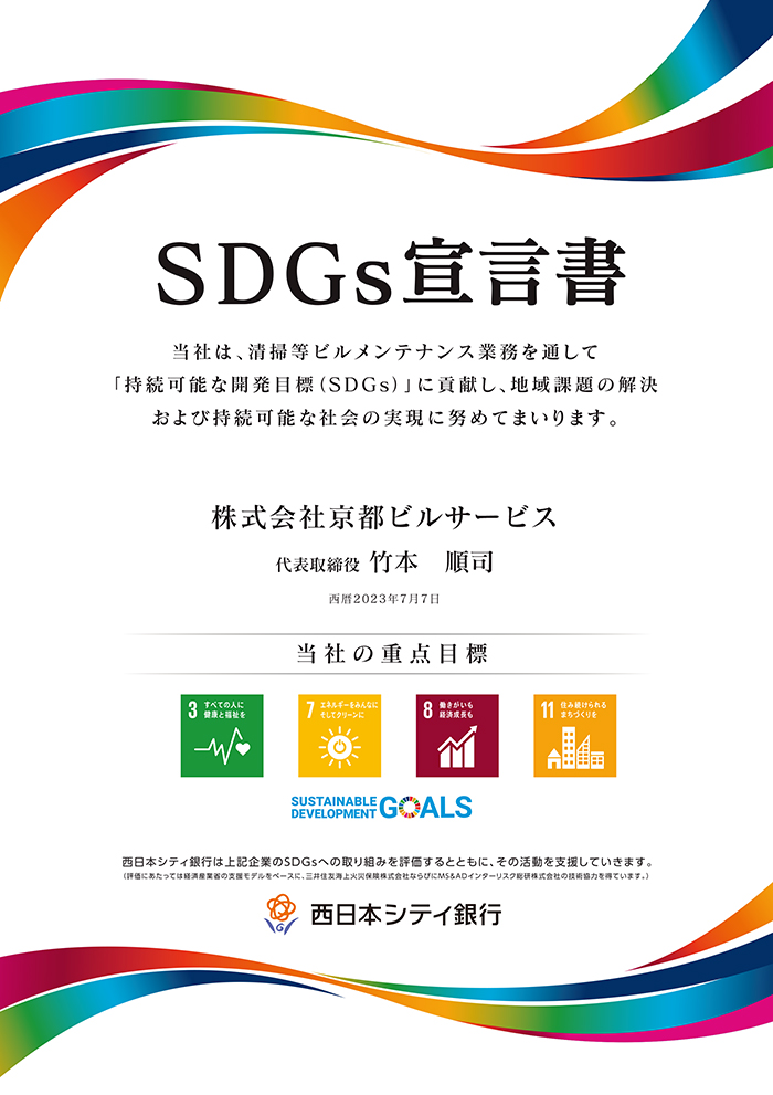 SDGs 拡大 × 株式会社 京都ビルサービス 代表者竹本 順司 住所福岡県行橋市西宮市2-14-26 業種ビルメンテナンス業 HPhttps://qz4va4bho.jbplt.jp/ 取組み もどる
