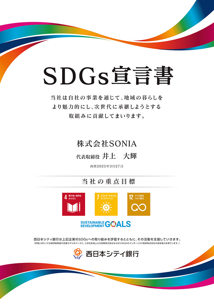 SDGs 拡大 × 株式会社 SONIA 代表者井上 大輝 住所福岡県福岡市中央区梅光園1丁目3-17 業種自動ドア保守、修理、交換、メンテナンス HPhttps://soniadoor.com 取組み もどる