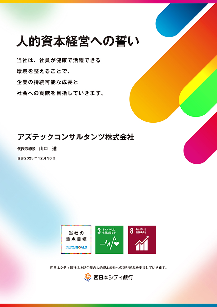 SDGs 拡大 × 人的資本経営 拡大 × アズテックコンサルタンツ 株式会社 代表者山口 透 住所福岡県久留米市原古賀町30-1 業種建設コンサルタント業 HPhttps://www.aztec-con.co.jp/ 取組み もどる